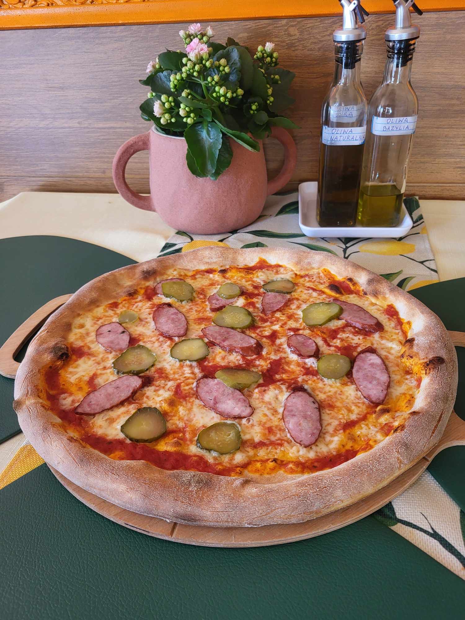 sos ze świeżych pomidorów, mozzarella, kiełbasa, ogórek kiszony